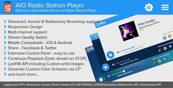 Responsive HTML5 Audio API with Flash Fall-back Supports: Shoutcast, Icecast, SAM Broadcaster, Radionomy, Centovacast and direct information from stream using ICY-METADATA Multi-channels with per channel settings Multi-language support based on Browser locale Mobile optimized (iOS and Android may not allow auto play) Quality Setting Switch (optional) LastFM API and Custom artist images support