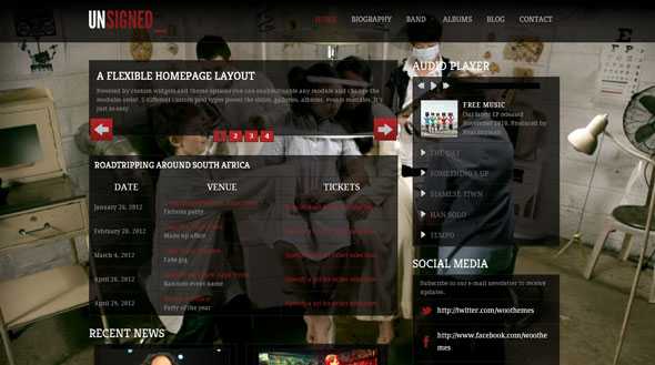 Unsigned is a hugely powerful, cleverly developed, yet super easy theme to use for musicians and bands looking to showcase their music, tours, photos, videos and band members all from within WordPress. It even allows you to sell your albums and merchandise thanks to the WooCommerce integration. It truly is a m*ssive theme that will cover your every need.