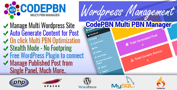 “CodePBN Multi PBN Manager” is a PHP script & included a WP Plugin for Wordpress PBN (Private Blog Network) or Manage your WP personal BLOG! Optimization is good for new WordPress Blog/Site, As soon as you install a fresh copy of WordPress on your server you have to optimize for better SEO. This script does all its own, it will install a random theme, a plugin for link juice kipper, also you can give plugin zip URL to install automatically and activate!