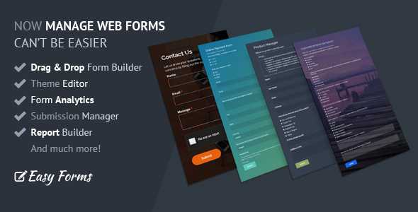 Easy Forms is a full featured form manager application that features a drag and drop php form builder, advanced notification, lead capture, conditional logic fields, multi-page forms, math calculations, form analytics, submission manager, themes, templates and much more!