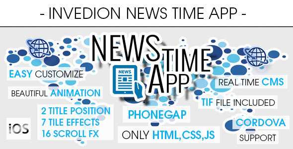 PhoneGap, PhoneGap Build, Cordova: HTML, CSS, JS, jQuery Compatible platforms: iOS (all phones and tablets) TIF layered graphic included – users can modify and create own template for all app 2 different text postions in tiles 7 unique tile animation effects 16 scroll animation effects Retina support Easily editable template