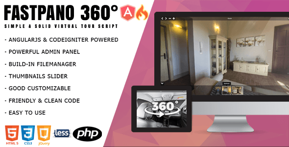 FastPano 360 is a php script that lets you create awesome virtual tours for your customers without advanced programming knowledge. Using the built-in filemanager you can easily upload and manage your panoramic and thumbnail photos, with the virtual tour manager you can quickly add new scenes and publish it for your clients. FastPano 360 is simple to use. It has admin and client parts. The admin part is used to manage virtual tours and the client part is used to view a virtual tour.