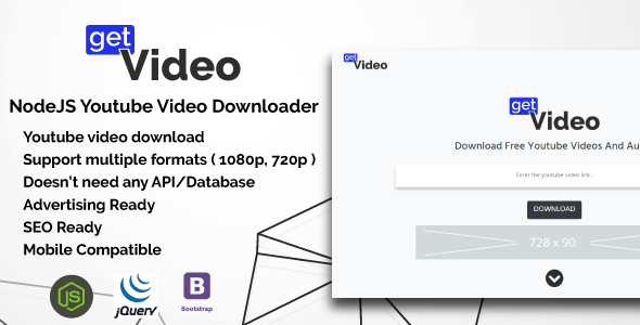 GetVideo was created with the latest technologies such as NodeJs ,Bootstrap 4, Jquery and others. You can download 1080p ( Video only ), 720p, 360p, 240p videos and Audio. Support MP4, WEBM, M4A and other file formats. The design is fully responsive based on bootstrap 4.