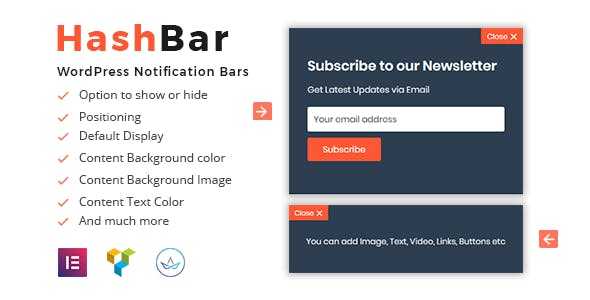 HashBar is a WordPress Notification / Alert / Offer Bar plugin which allows you to create unlimited notification bars to notify your customers. This plugin has option to show email subscription form (sometimes it increases up to 500% email subscriber), Offer text and buttons about your promotions. This plugin has the options to add unlimited background colors and images to make your notification bar more professional.
