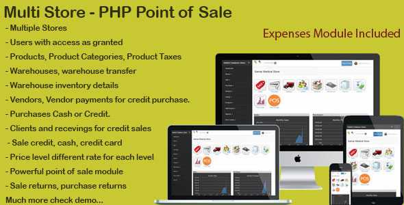 PHP Point of sale is a powerful store management system which gives you ability to create unlimited stores and every store have its own products, clients, vendors, rates, warehouses, reports, payments, receivings, returns and much more…