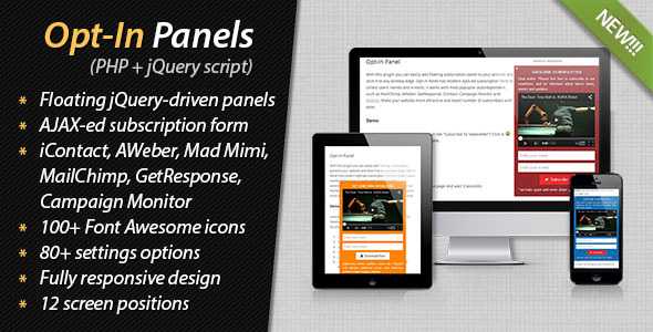 With this script you can easily add floating opt-in panel to your websites and stick it to any window edge. Opt-In Panels has modern AJAX-ed subscription form to collect users’ names and e-mails. It works with most popular autoresponders, such as MailChimp, AWeber, GetResponse, iContact, Campaign Monitor, Mad Mimi. Make your website more attractive and boost number of subscribers with ease.