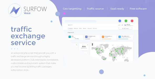 SURFOW V6 is the most advanced script available for traffic exchange, it function fully automatic with an integrated exchanger software for multiple platforms, Windows/macOS/linux, it quiqly provide you with a traffic exchange service for your clients, SaaS ready script which make it easy to generate real income by selling traffic packages, subscriptions, slots, fully customizable administration panel and user interface, built to perform fast and securely, it has a built in integration for : Paypal - Authorize.Net - Stripe - 2Checkout - Robokassa - Payza (EU) , fully translatable with a 16 languages included, responsive and clean template, it comes with a homepage builder to let you customize the template of your homepage