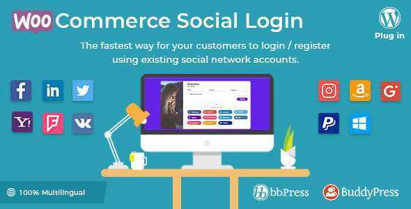WooCommerce Social Login extension allows users to login and checkout with social networks such as Facebook, Twitter, Google, Yahoo, LinkedIn, Foursquare, Windows Live, VKontakte (VK.com), Instagram, PayPal, Amazon.