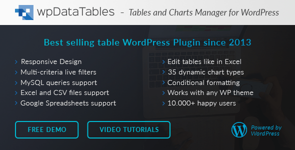 wpDataTables is a mighty data manager in a form of a WordPress plugin. It helps you to create dynamic responsive tables, charts in your WordPress site edit and allow your front-end users to edit data in them. See the video features overview or the text features overview if you’re interested.