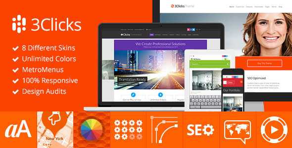 The 3Clicks is the most flexible and complete theme we’ve ever created. Its modern and fully responsive design best fits into current web trends. Included skins and demo content makes it ready to work in just a few minutes. We put a lot of effort to make the theme intuitive to use and easy to customize. You won’t find any better tool to build exceptional sites (blog, business, portfolio, products etc)! We’re proud of this theme and we hope you’ll also be.