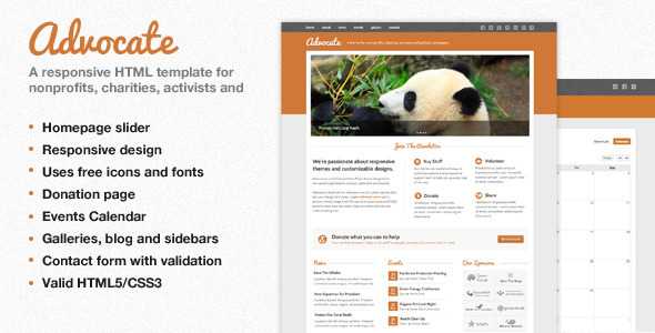 Advocate is a responsive HTML template ideal for nonprofits, charities, activists and political campaigns. Clearly display your events, news, sponsors and programs making it easy for users to donate to and learn more about your cause.