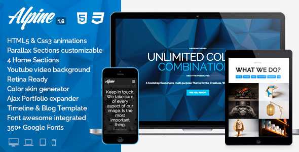 Alpine is a modern professional and flexible one page parallax responsive multi-purpose WordPress theme, developed in Bootstrap framework with great attention to details. Theme can be used for any type of website: business, corporate, portfolio, products, marketing, etc. You can modify layout, styling, colors directly from within the backend.
