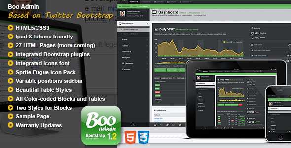Boo template is a flexible Twitter Bootstrap HTML5 template for backend, user interface or administration, both for desktop and mobile users. Built on latest Twitter Bootstrap 2.2.2. Boo maintaining native Bootstrap functionality, enriched of pleasing design and tons of new template features, makes it very powerful kit for rapid development