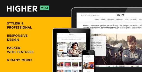 Higher is a premium flexible professional theme suited for any type of website: business, corporate, portfolio, blog, products, etc. The theme was made to not only look and behave great in the latest desktop browsers, but in tablet and smartphone browsers via responsive CSS as well. It includes such great features as premium javascript and WordPress plugins, tons of shortcodes, unlimited galleries, animated sortable portfolio, unlimited slideshows, powerful theme options, and even AJAX powered pages!