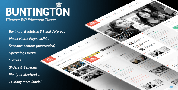 Buntington – school – university – education WP theme. Ultimate and plugin-less solution for any type of school, education or a non-profit organization. It was built with Bootstrap (3.1) and Vafpress framework which guarantees great user and further development/customization experience.