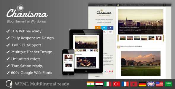 Charisma is a Premium Responsive WordPress Blog theme with clean design Very easy to customize, with multiple header Design, advanced theme options, multiple layout, tons of very useful and handy shortcodes , come with 6 post types (standard posts, Quote, Gallery, Audio, Video, Image), unlimited colors, html5 video, 100% Retina Ready with HD graphics and vector icons, shortly Charisma Designed to make your blogging experience very simple. suited for users who want to run a professional or personal blog.
