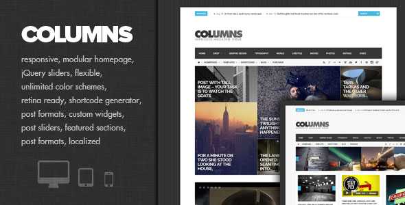 Columns is modular and flexible magazine and blog theme with responsive layout and elegant styling. You have complete & unlimited control over the homepage. Theme includes lots of features like full-screen slider, modular homepage, layout shortcodes and more. All functions and are based on solid back-end framework.