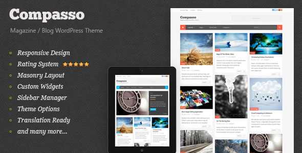 Compasso is a premium Magazine/Blog WordPress theme built with HTML5/CSS3. It is well suited for magazine, blog, or any websites with great amount of contents.