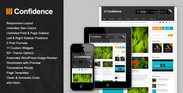 The Confidence WordPress theme is perfect for personal blogs and magazine sites, it also can be used as a personal portfolio. Responsive layout makes it easier for your visitors to open your site from any various devices. Confidence is very easy to be customized for beginners or experts, with more than 80 theme options allow you to do it all from just one page.