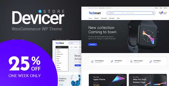 Devicer store theme is a all-in-one solution for an online digital store or electronics market. A fully integrated and styled Woocommerce shop section, with useful addons lets you create a really powerful electronics, mobile and digital products store. Tech Store theme comes with several ready demo versions, but you can easily build your custom home page, as theme functionality is really huge.