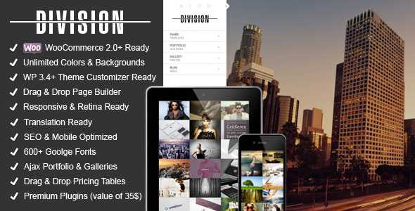 Division is a premium wordpress theme siutable for frelancer, creative agency, art directors, illustrators, photographers or bloggers. Built in drag&drop page builder makes creating and managinig new pages, posts and portfolios a breeze. WP 3.4+ theme cusotmizer makes creating and tweaking skins so easy. Admin panel allows to change almost any color and background of page and supports uploaders for Retina HiDpi displays making Your site super sharp on devices like iPad or iPhone.