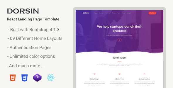 Dorsin – Responsive Landing Page Template built with ReactJs and most popular front-end framework Bootstrap version 4.2.1. It would be perfect for an app product showcase, startups, personal websites, and even web agencies. You will be easily able to customize it for your needs. It looks beautiful with all sizes, be it a Monitors, laptop screen, iPad, iPhone, Android Mobile or tablets. It has everything you need to launch your site in a couple of hours! We created reusable react components, so you can build multiple apps with common components.