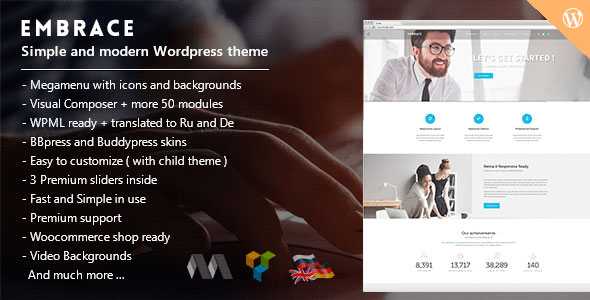 Embrace is multi-purpose, powerful, responsive theme. It is equipped with endless options, tools and features, therefore highly customizable and suitable for almost any website type – from corporate to creative.