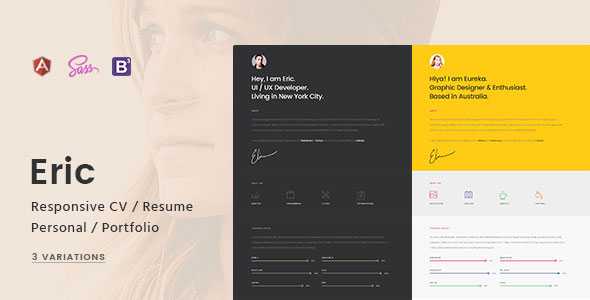 ERIC is a Responsive CV / Resume / V-Card / Personal Website / Portfolio Template made with latest technologies Html5, Bootstrap, Sass & Angular js. Introduce yourself like a professional with this unique beautiful design. Provide every important information with awesome design components to your clients or employers.