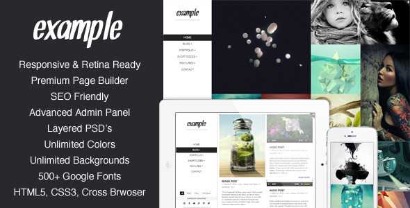 Example is an advanced multi-purpouse portfolio Theme. Easy to setup, enhanced with Massive Panel, Visual Composer and custom shortcode wizard. This combination makes creating content extremely easy.