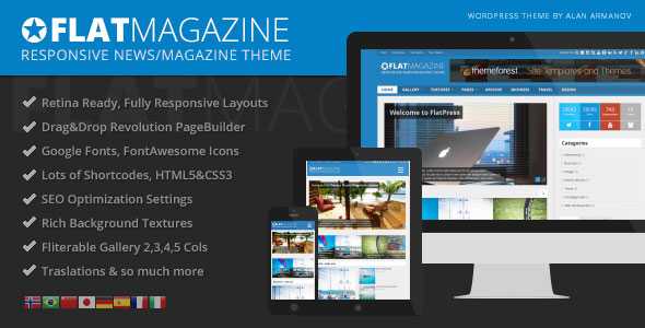 FlatMagazine V1.4 – is a Premium Responsive News/Magazine Theme, very intuitive and completely ready to use out of the box. It comes with lots of options, so you can change the layout(Wide & Boxed), style, colors, and fonts. You can assemble any layouts with Revolution PageBuilder, Lots of elements, shortcodes, widget areas, icon generator and predefined pages. Create your own style or use one of the 18 predefined skins directly from your admin panel.