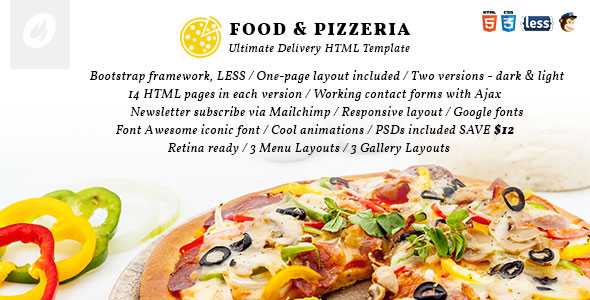 FOOD & PIZZERIA is a powerful and Rich HTML5 Template made specially for Food Delivery System and also for Restaurants and Shops. It has included a variety of Homepage Layouts which makes it a Rich and powerful Template. It is built upon Bootstrap 1170px Grid, and it has Retina Ready Icons. It has been designed pixel perfect and files are organized in beautiful way so you can easily access them and change them.