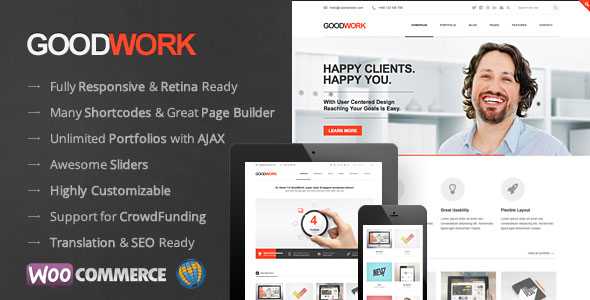 GoodWork is the absolutely ultimate theme for your business! It is an elegant & modern solution packed up with an incredibly great amount of high quality features. Shortcodes, sliders, layout builders, theme options, page templates, multilanguage support, responsiveness and retina ready, etc., are all in here! Beautiful outside backed by a great framework and supported by professionals, this is the all in one WordPress solution for your business!!