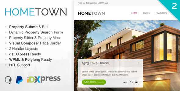 Hometown is a Premium WordPress Theme for Real Estate related websites. It has elegant & clean design and comes with lots of features like property search, property slider, property map with stylish markers, front end user login & register, front end property submit & edit, payment integration with PayPal, dsIDXpress IDX Plugin support, WPML plugin support, custom widgets, various templates, well designed theme options & meta-box, Google reCAPTCHA support and much more …