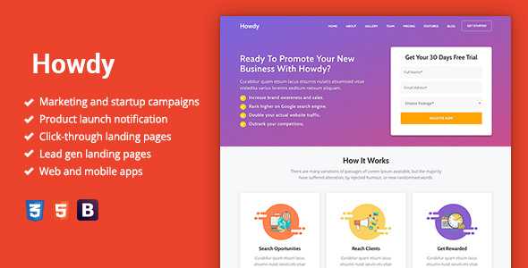 Howdy is a clean and modern high-converting landing page template, very easy to customize according to your needs. This landing page template can be used to promote web apps, mobile apps and all kind of marketing and startup websites. Quick and easy to setup.