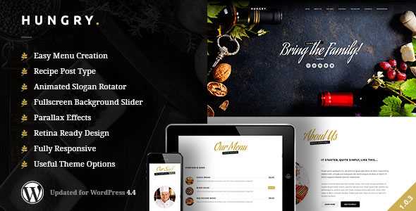 Hungry is a clean, simple, one-page WordPress theme that is ideal for any restaurant business. Its modern look, animated slogan rotator and fullscreen backgrounds are sure to be a hit with your potential diners! Easily manage recipes, menus and the appearance through custom post types and an intelligent theme options panel.