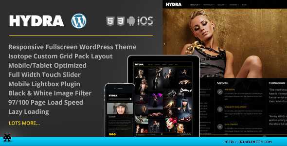 Hydra is a fully responsive portfolio grid WordPress theme suitable for any kind of creative or business use. Built upon the responsive Twitter Bootstrap framework, the theme is highly optimized for both mobile and desktop platform and scores 97/100 in the Google Page Speed Test which ensures lightning fast loading time due to lazy-loading of images and compression of css/javascript.