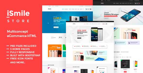 iSmiler Store is a multi-concept and responsive eCommerce HTML Template with clean and modern design. It is perfectly suitable for any kind of web shop that is selling tech items or any other types of products. All HTML files are well-organized for easy find and edit the desired items or colors etc.