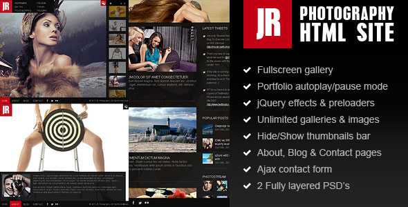 JR Photography HTML Site template represents stylish and elegant fullscreen gallery for photographers, artists, designers, personal projects and other purposes. The template is equipped with amazing jQuery effects, sliders and preloaders that provide awesome visibility to portfolio images.