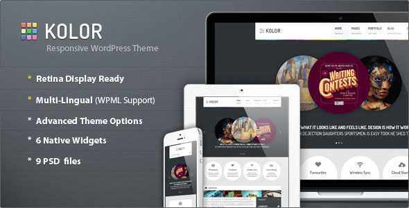 Kolor theme is a responsive business and portfolio wordpress theme designed with the latest web standards (HTML5 and CSS3 ) and designed to work with any device, it fits perfectly on three types of devices.