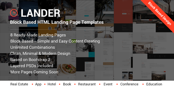 Lander is block based HTML landing page template with clean, minimal and modern design. Block based design means that you can create unlimited combinations of the content and so you can create unlimited number of landing pages. You are not forced to use only one predefined design. You need just this one template to create landing page for any purpose.