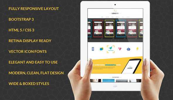 Leader Responsive Bootstrap Template Details: Fully Responsive Layout Bootstrap 3.3.1 HTML 5 / CSS 3 Retina Display Ready Vector Icon Fonts Elegant and Easy to Use