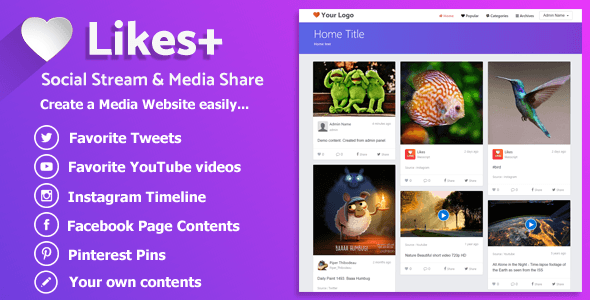 Likes Plus is a Social Stream Script to create a website with Twitter, YouTube, Instagram, Facebook and Pinterest contents. You can create easily media website by liking popular Tweets or YouTube videos, in addition to you can fetch your Instagram and Facebook page timeline and Pinterest Board Pins. Likes Plus fetches contents from Social Media Providers and saves those contents to your site database and creates custom styled Tweets, videos and images.
