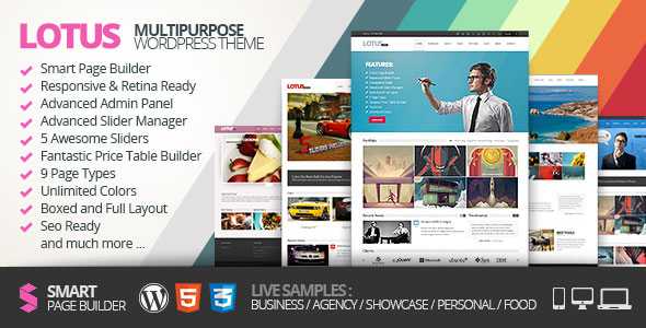 Lotus is a powerful and flexible theme that comes with very rich tools and options to make creating website as simple as possible. For example one of its tools is Smart Page Builder. In short, this is an awesome drag & drop page building tool. By this tool you can create any page (for example home page) layout with very rich collection of web elements in a minute without writing html or touching even one line of code.