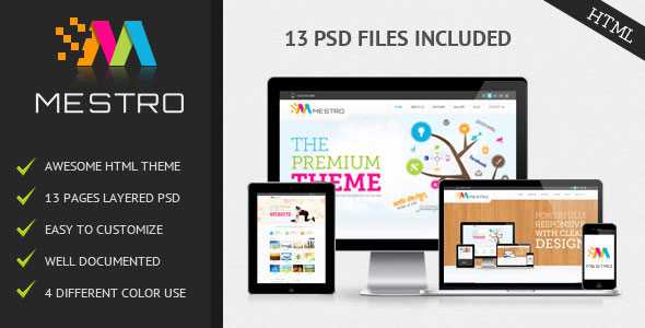Mestro is very flexible, easy for customizing and well documented, approaches for personal and professional use. The full layered PSD file included have been customized easily. Mestro HTML template perfect to promote your work or your business.