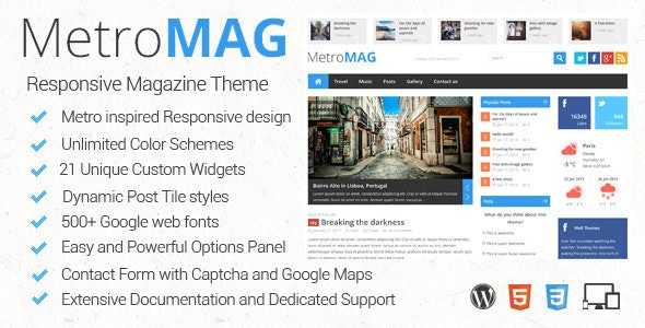 Metro Magazine is a clean and powerful metro inspired responsive magazine WordPress theme designed specifically for magazine, news and blog sites. The theme is highly flexible, fully responsive and packed with awesome features. It is incredibly easy to use and ready to be up and running out of the box. Created using the latest HTML5 and CSS3 techniques.