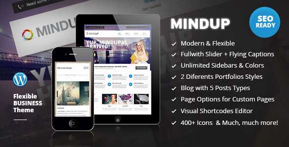 MindUp is the perfect solution for your business Wordpress Website. Flexible & Responsive (works on all devices, including mobile based), it comes with 50+ Visual Shortcodes, Unlimited Portfolios so you can present your products properly, fully and easily customizable Pages and Posts, MindUp is the ideal solution for your business.