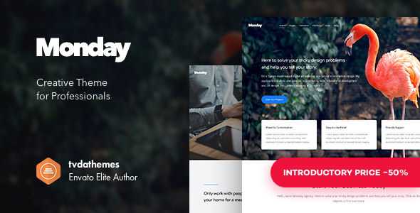 Monday is a multi-purpose, clean, creative, fully responsive and powerful WordPress Theme. Our theme has included multiple header layouts, Revolution Slider plugin, drag & drop visual page builder (Visual Composer), powerful theme options panel, video backgrounds, parallax, many elements, 600+ Google Font and more. Great modern design and Powerful features makes Monday irresistible.