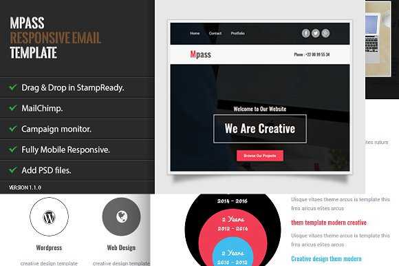 Mpass - Responsive Email template with Stampready builder. Fully Responsive and Major email client Supported.You can easily make changes through MailChimp, campaign monitor or Drag & Drop in StampReady. Without any coding knowledge. Very Good Performance For Business, Portfolio ,Multipurpose and Any Purpose.