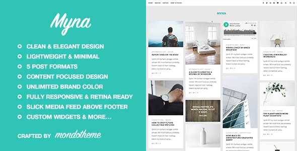 Myna is an elegant, clean, modern, minimal, responsive and masonry WordPress blog theme. Myna’s content focused design will give your readers a great reading experience. Moreover, an off-canvas menu, a minimal masonry design, a social bar and a media feed (Instagram, Dribbble or 500px) will help your blog stand out of the others. Myna also comes with the trustworthy support service of MondoTheme.