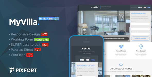 “MyVilla ” is a Real Estate HTML Landing page template, include a lots of features, clean & modern design, you can make an awesome landing page in minutes with a working contact Form.